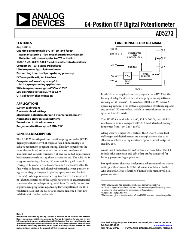 The AD5273 is a 64-position, one-time-programmable (OTP)