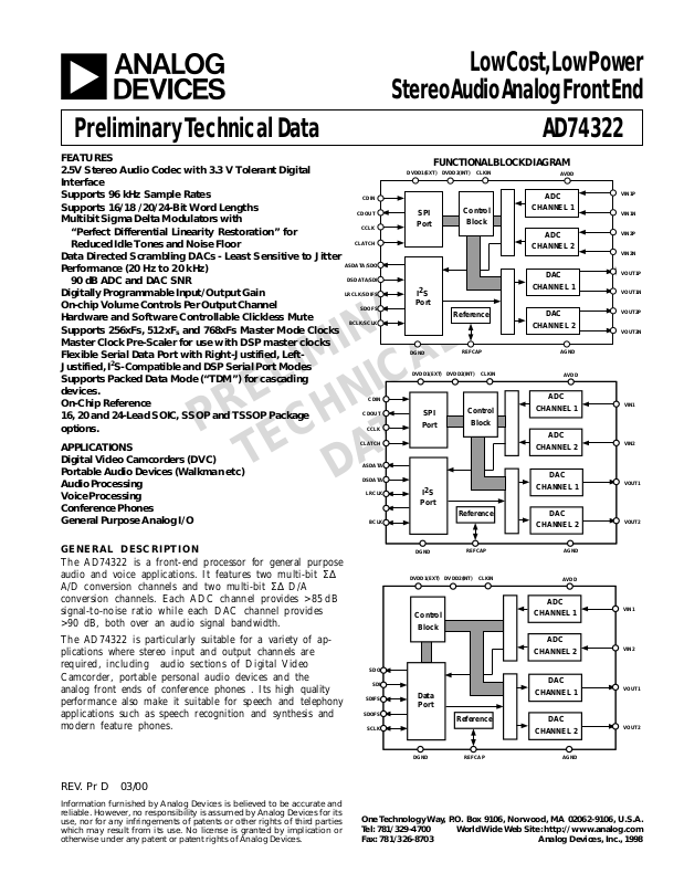The AD74322 is particularly suitable for a variety of applications where stereo input and output channels are