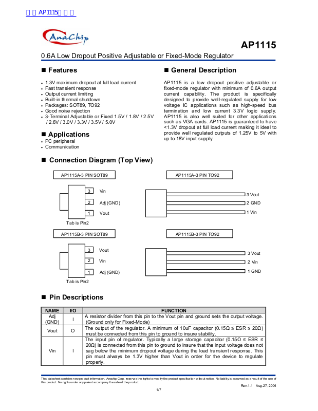 This datasheet contains new product information. Anachip Corp. reserves the rights to modify the product specification without notice. No liability is assumed as a result of the use of