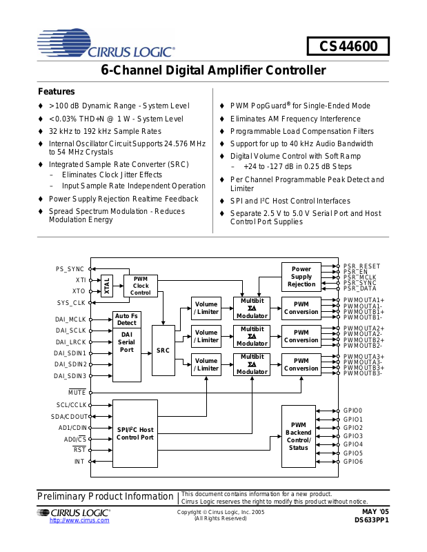 The CS44600 is a multi-channel digital-to-PWM Class D audio system controller including interpolation, sample rate