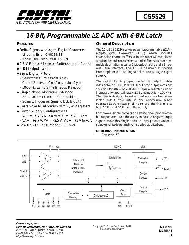 The 16-bit CS5529 is a low-power programmable ∆Σ Analog-to-Digital Converter (ADC) which includes