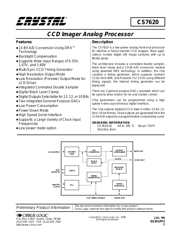 Preliminary product info rmation describes products which are i n production, but for whi ch f ull characterization data is not yet available. Advance produ ct i nfor mation describes products which are in development and subject to development changes. Cirrus Logic, Inc. has made best efforts to ensure that the information