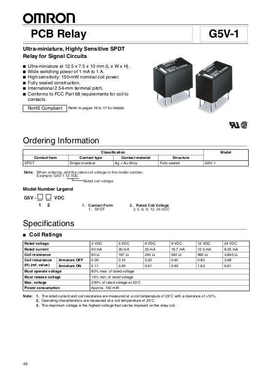 G5V-1 SPDT 3 to 24 VDC 0.5 A, 125 VAC (general use)