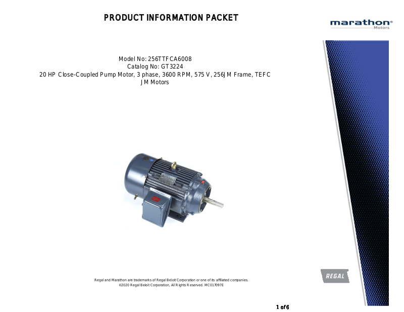 Product Information Packet: Model No: 256TTFCA6008, Catalog No:GT3224 20 HP Close-Coupled Pump Motor, 3 phase, 3600 RPM, 575 V, 256JM