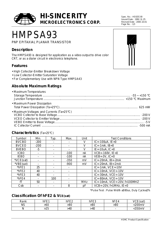 Style : Pin 1.Emitter 2.Base 3.Collec tor