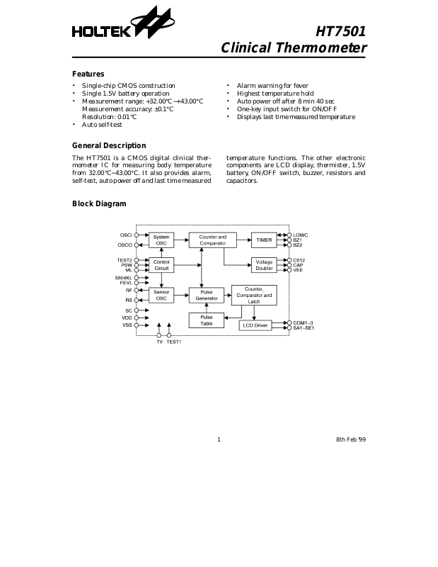 The HT7501 is a CMOS digital clinical thermometer IC for measuring body temperature