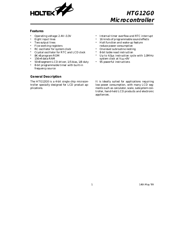 The HTG12G0 is a 4-bit singl e chip microcontroller specially designed for LCD product applications.