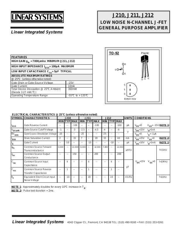 HIGH GAIN gfs = 7000µmho MINIMUM (J211, J212)