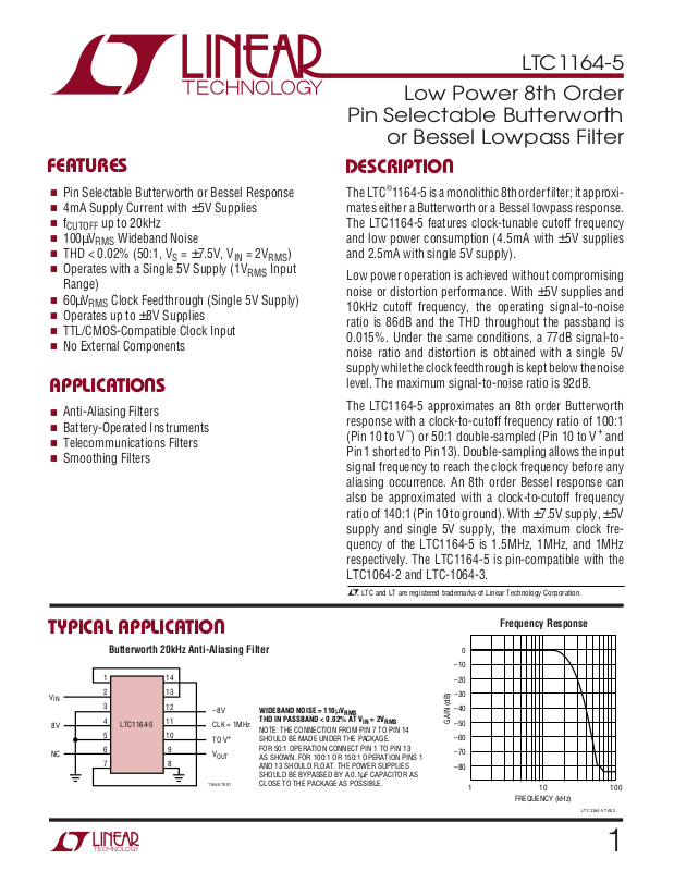 The LTC®1164-5 is a monolithic 8th order filter; it approximates either a Butterworth or a Bessel lowpass response.