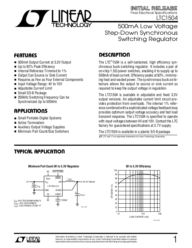 The LTC1504 is available in adjustable and fixed 3.3V