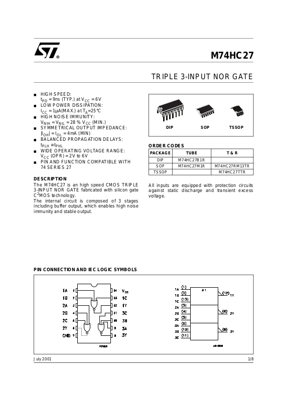 The M74HC27 is an high speed CMOS TRIPLE 3-INPUT NOR GATE fabricated with si licon gate