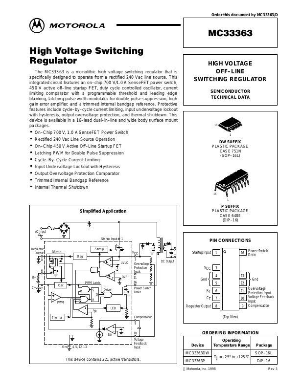 integrated circuit features an on–chip 700 V/1.0 A SenseFET power switch,