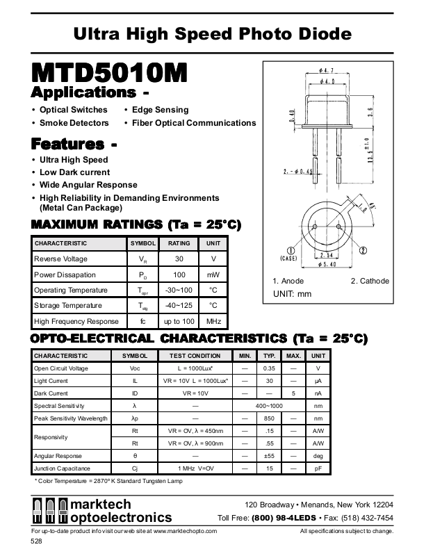 For up-to-date product info visit our web site at www.marktechopto.com All specifications subject to change.