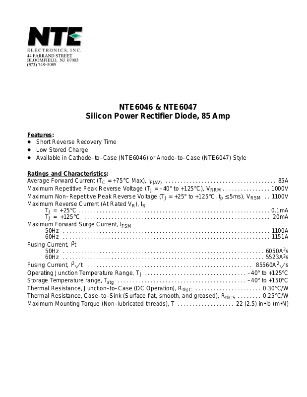 D Available in Cathode–to–Case (NTE6046) or Anode–to–Case (NTE6047) Style