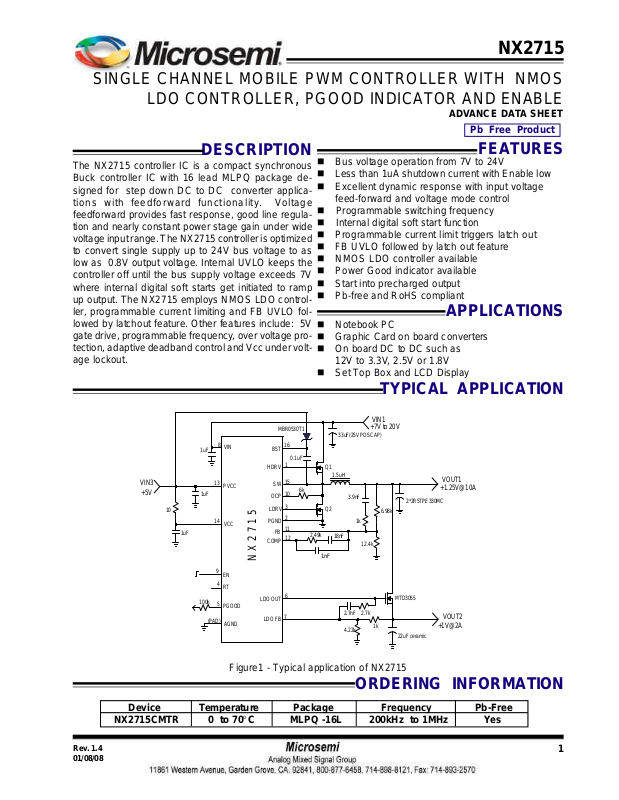 up output. The NX2715 employs NMOS LDO controller, programmable current limiting and FB UVLO followed by latchout feature. Other features include: 5V