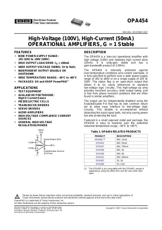 Datasheet OPA454, OPA454AIDWDR Datasheet (Texas Instruments)