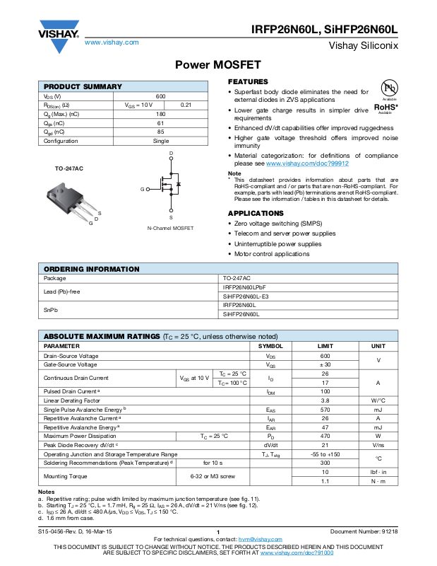 = 25 °C, L = 1.7 mH, Rg = 25 Ω, IAS = 26 A, dV/dt = 21 V/ns (see fig. 12).