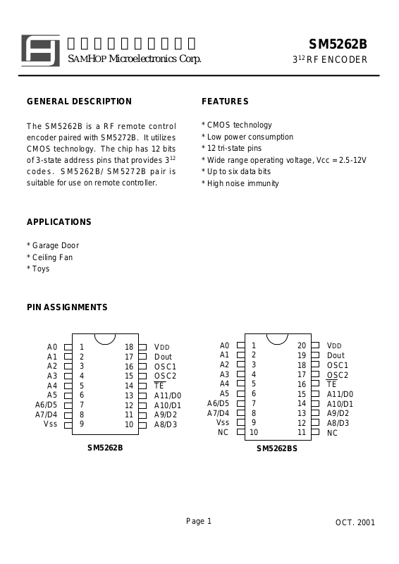Datasheet SM5262B, SM5262BS Datasheet (SamHop Microelectronics)