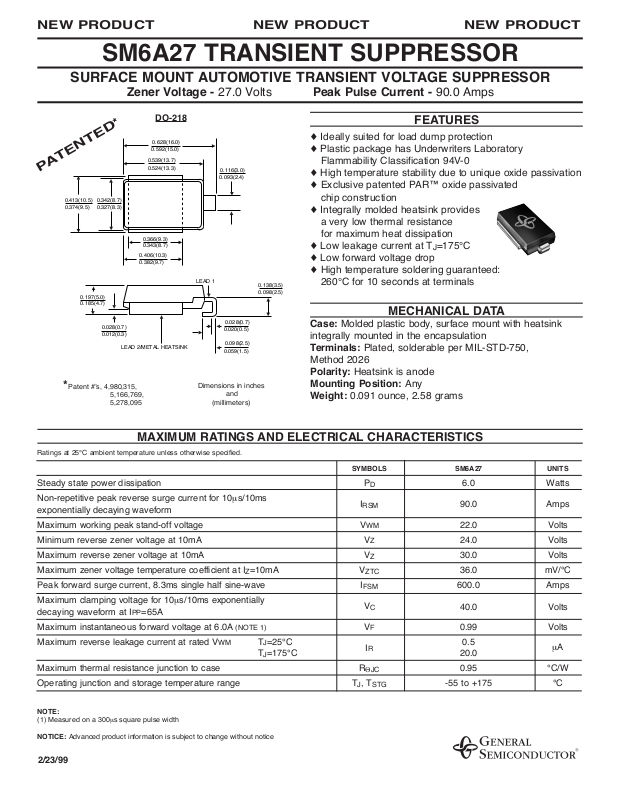 Zener Voltage - 27.0 Volts Peak Pulse Current - 90.0 Amps