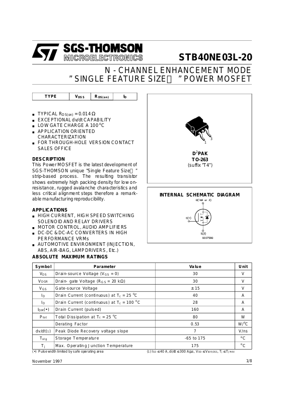 (•) Pulsewidth limited bysafe operating area (1)ISD≤ 40 A,di/dt ≤ 300 A/µs, VDD≤ V