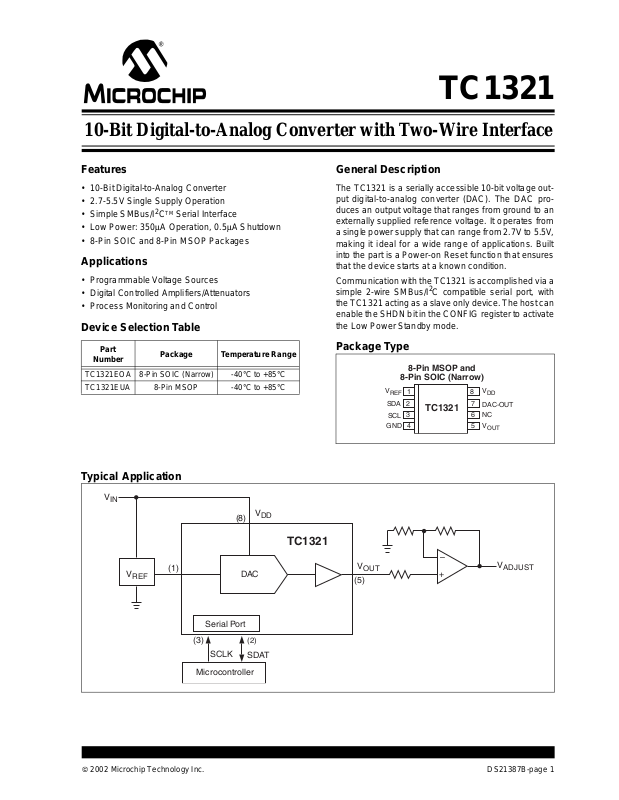 The TC1321 is a serially accessible 10-bit voltage output digital-to-analog converter (DAC). The DAC produces an output voltage that ranges from ground to an