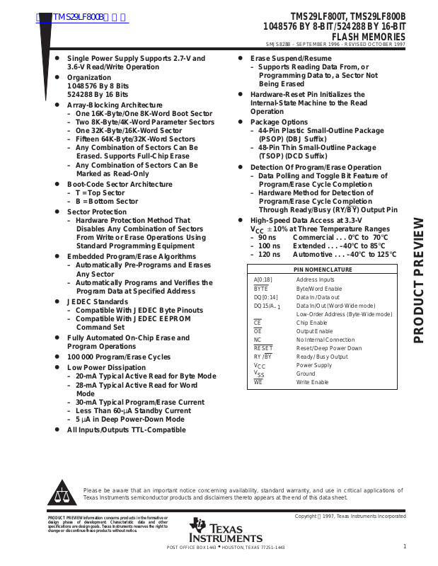 The TMS29LF800T/B is a 1048576 by 8-bit/524288 by 16-bit (8388608-bit), 3-V single-supply , programmable