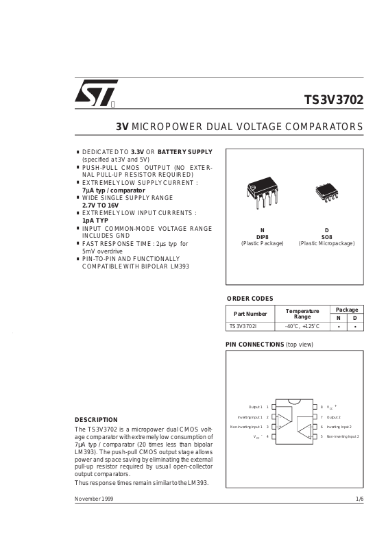 The TS3V3702 is a micropower dual CMOS voltagecomparator withextremelylow consumption of