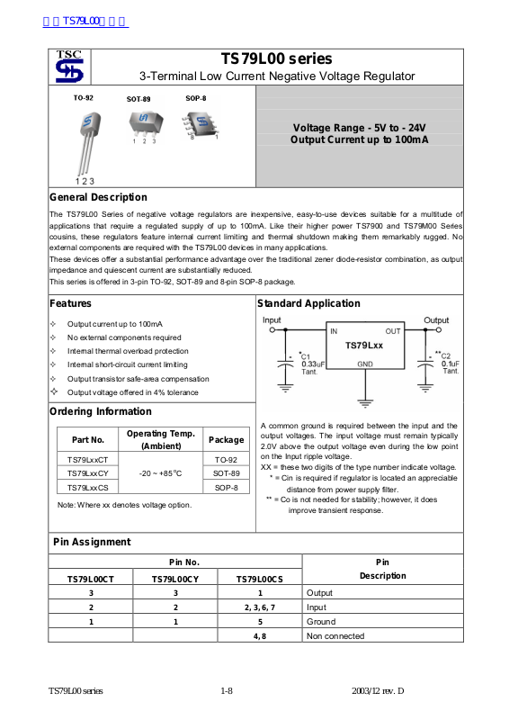 applications that require a regulated supply of up to 100mA. Like their higher power TS7900 and TS79M00 Series