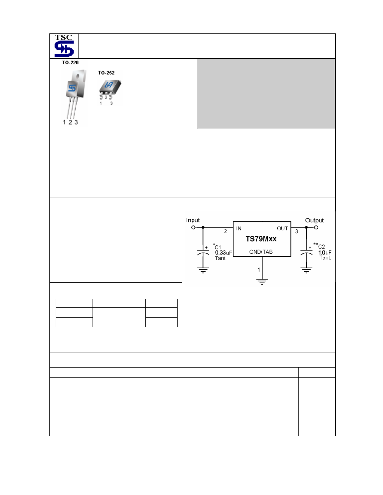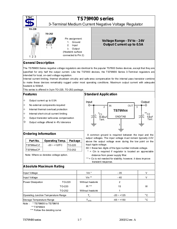 The TS79M00 Series negative voltage regulators are identical to the popular TS7900 Series devices, except that they are specified for only half the output current. Like the TS7900 devices, the TS79M00 Series 3-Terminal regulators are intended for local, on-card voltage regulation. Internal current limiting, thermal shutdown circuitry and safe-area compensation for the internal pass transistor combine to make these devices remarkably rugged under most operating conditions. Maximum output current with adequate heatsink is 500mA This series is offered in 3-pin TO-220, TO-252 package.