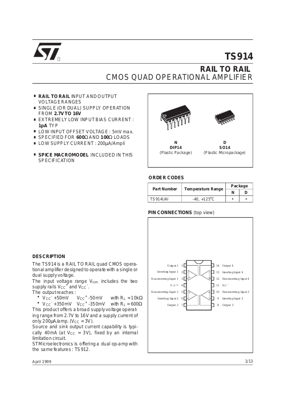 The TS914 isa RAILTO RAIL quad CMOSopera­tional amplifier designedtooperatewith a singleor dual supply voltage. The input voltage range V
