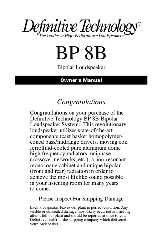 BP 8Bs or their set-up. Please contact your nearest Definitive Technology dealer or