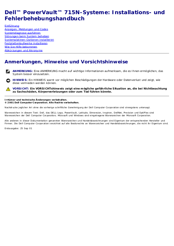Warenzeichen in diesem Text: Dell, das DELL-Logo, PowerVault, Latitude, Dimension, Inspiron, DellNet, Precision und OptiPlex sind