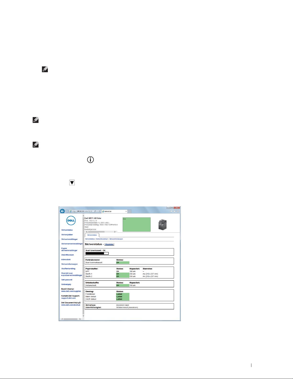 For å starte Dell Printer Configuration Web Tool, tast inn skriverens IP-adresse i nettleseren. Skriverkonfigurasjonen