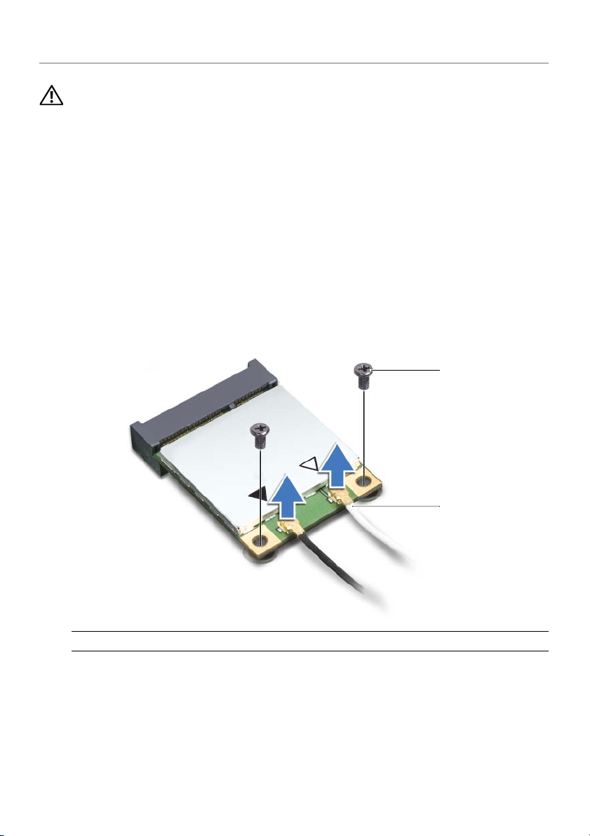 2 從無線迷你卡上拔下天線纜線,然後將天線纜線從其固定導軌中取出。