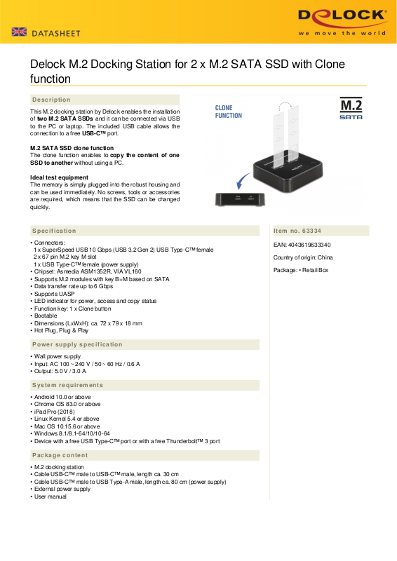 Delock M.2 Docking Station for 2 x M.2 SATA SSD with Clone