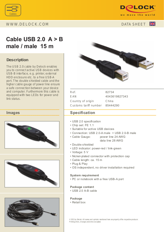 • Connection: USB 2.0-A male > USB 2.0-B male