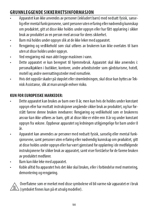 • Apparatet kan ikke anvendes av personer (inkludert barn) med nedsatt fysisk, sanselig eller mental funksjonsevne, samt personer uten erfaring eller nødvendig kunnskap