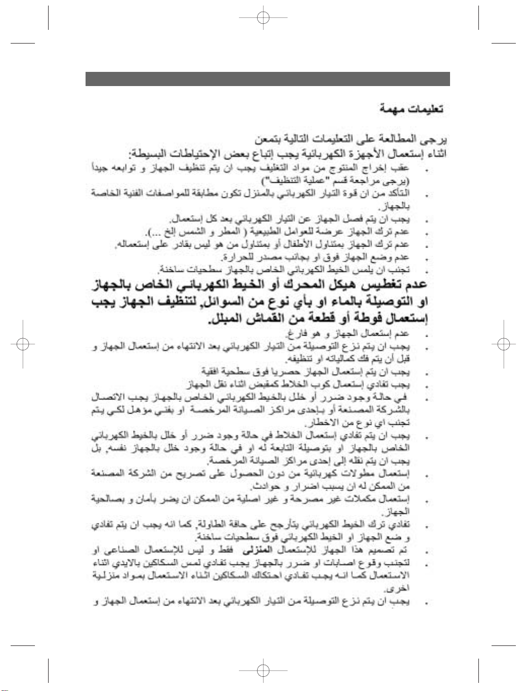 • NE JAMAIS PLONGER LE CORPS MOTEUR, LA FICHE OU LE CABLE ELECTRIQUE DANS DE L’EAU OU