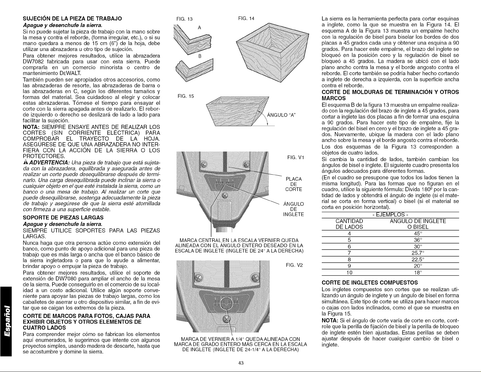 TABLA 1: CORTE DE INGLETE COMPUESTO (ubique la madera con el lado piano ancho sobre la mesa y el borde angosto contra el reborde)