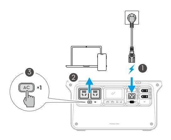 Jeśli nastąpi przerwa w dostawie prądu i w stacji zasilania wyczerpie się akumulator, wyjście AC może zostać automatycznie włączone po wznowieniu zasilania. Podłącz stację zasilania do gniazda zasilania AC i urządzenia zewnętrznego, naciśnij i przytrzymaj przycisk AC, aby włączyć tę funkcję.