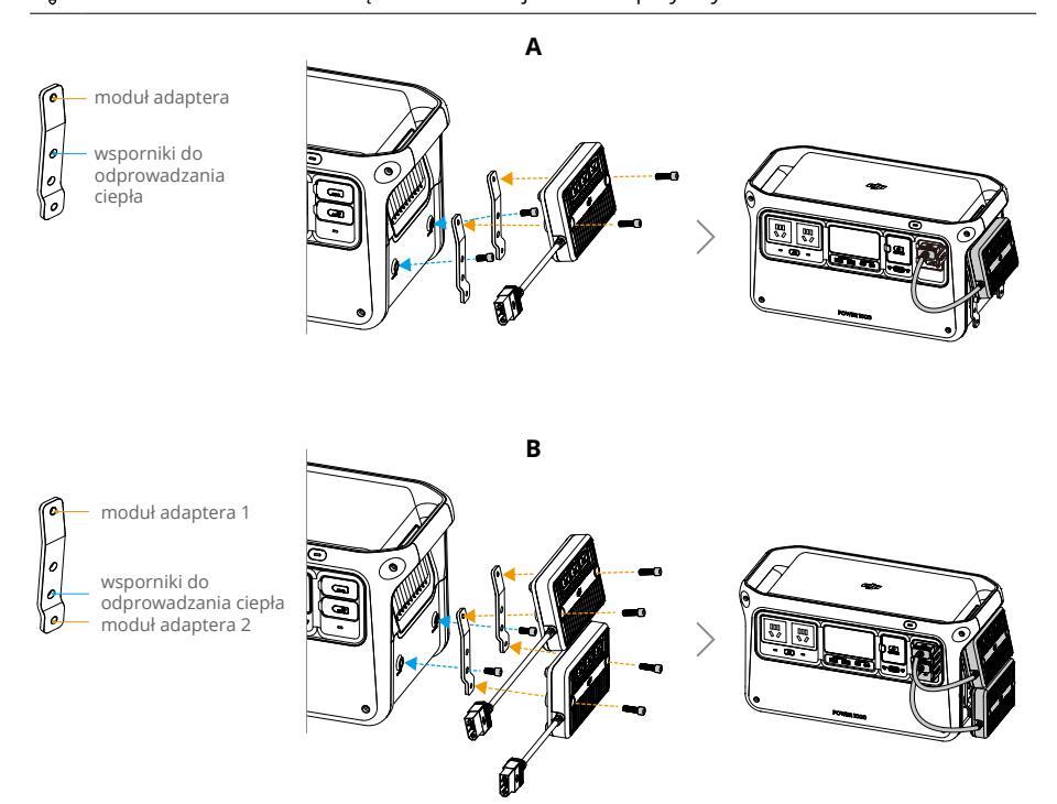 Ustaw odpowiednio otwory montażowe w dolnej części wsporników i przymocuj dwa moduły adapterów do stacji zasilania zgodnie z rysunkiem B.