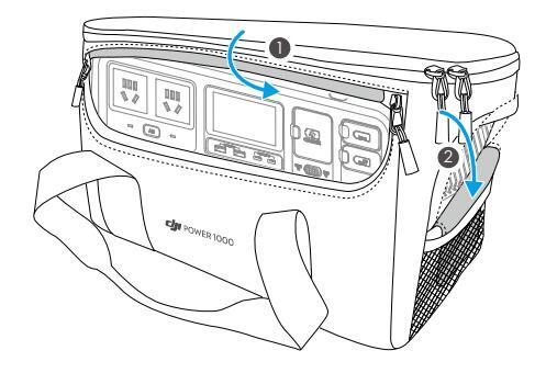 W przypadku stosowania z torbą ochronną stacji DJI Power 1000, otwórz torbę z obu stron — tak, aby uniknąć zablokowania otworów wentylacyjnych i przegrzania.
