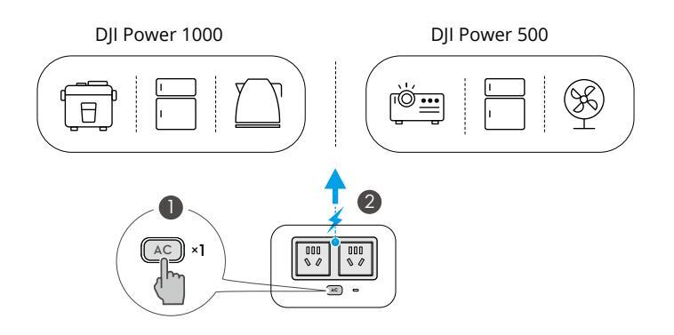 Stacja zasilająca ma dwa porty wyjściowe prądu przemiennego. Podłącz urządzenie zewnętrzne do portu wyjściowego prądu przemiennego i naciśnij przycisk wyjścia prądu przemiennego.