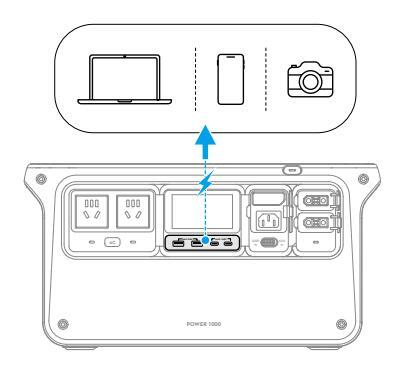 Stacja zasilająca ma dwa porty USB-A i dwa porty USB-C. Podłącz urządzenie zewnętrzne do zasilania przez port USB-A lub USB-C.