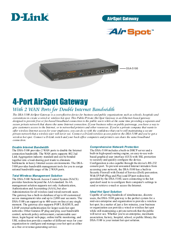 The DSA-5100 AirSpot Gateway is a cost-effective device for business and public organizations such as schools, hospitals and