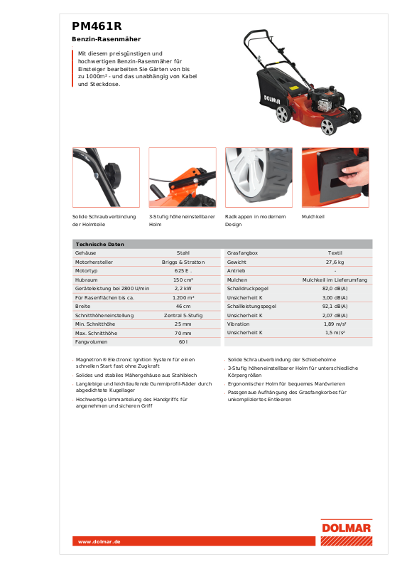 Geräteleistung bei 2800 U/min 2,2 kW Schalldruckpegel 82,0 dB(A)