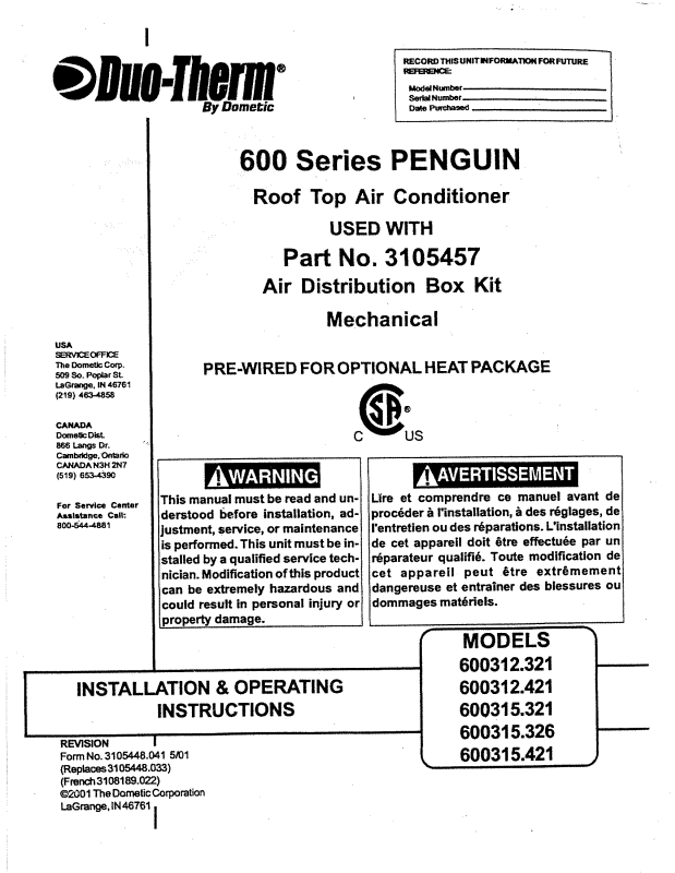 Dometic 600312.321, 600312.421, 600315.321, 600312.326 User Manual