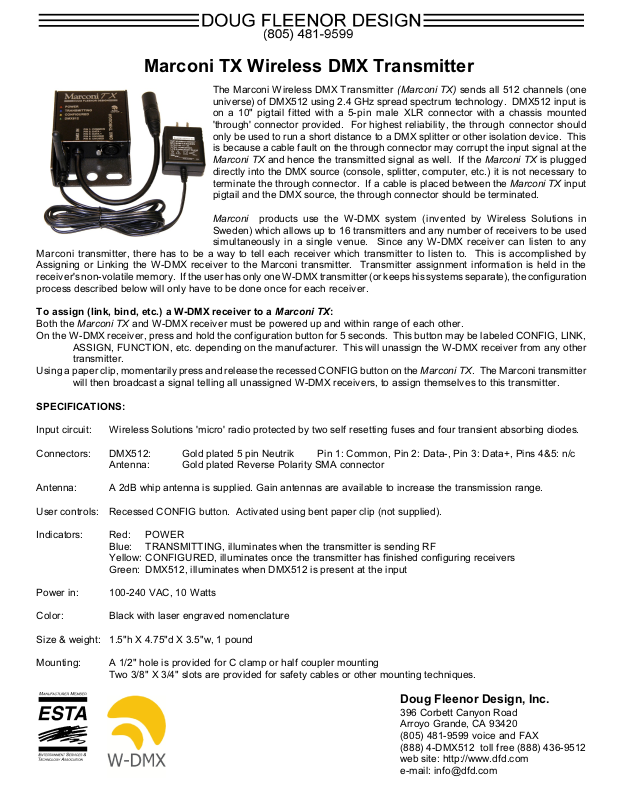 Both the Marconi TX and W-DMX receiver must be powered up and within range of each other.