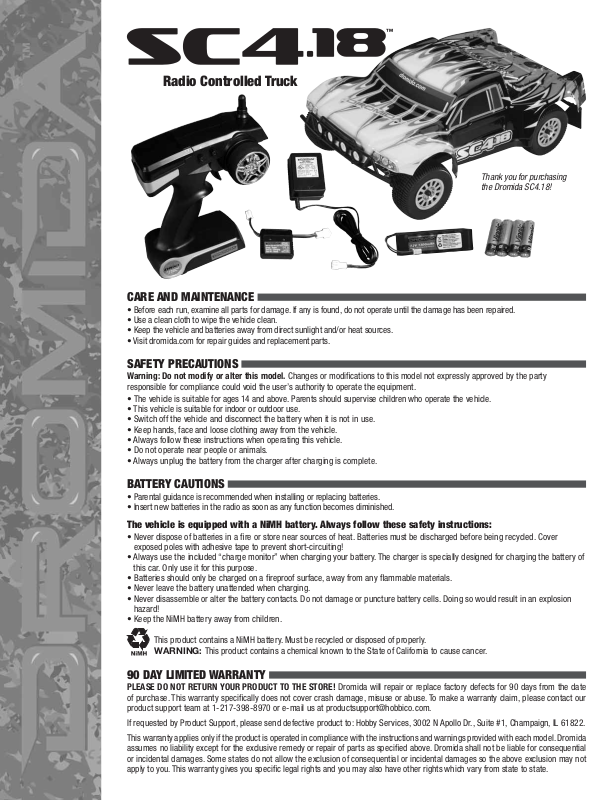 If requested by Product Support, please send defective product to: Hobby Services, 3002 N Apollo Dr., Suite #1, Champaign, IL 61822.
