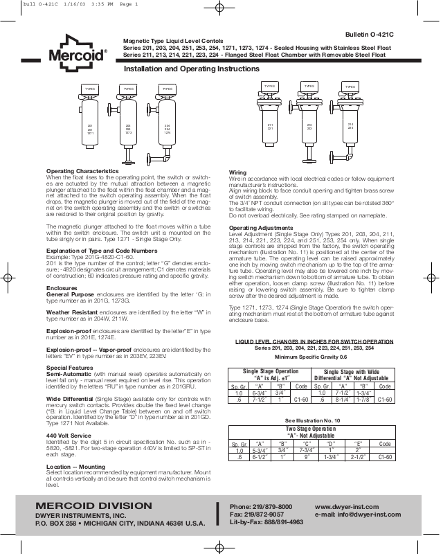 Series 201, 203, 204, 251, 253, 254, 1271, 1273, 1274 - Sealed Housing with Stainless Steel Float